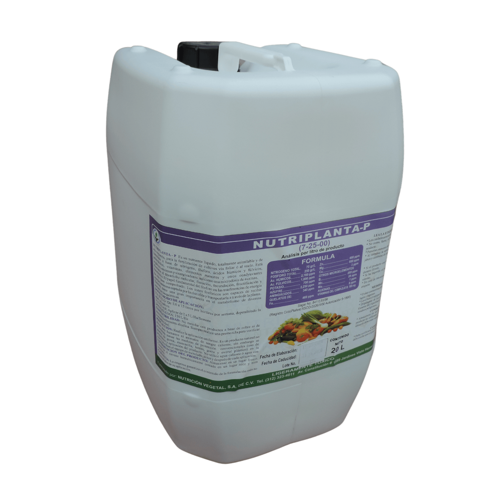 Fósforo líquido como ortofosfato, fosfato diamónico y monoamónico. Alta asimilación y rápida respuesta vía foliar y al suelo. Está formulado a base de nitrógeno, fósforo, ácidos húmicos y fúlvicos, aminoácidos, elementos menores y otros coadyuvantes orgánicos, enzimas y sinergizadores, así como una microdosis de auxinas. NUTRIPLANTA-P promueve el desarrollo radicular, floración, fecundación, fructificación y fotosíntesis.