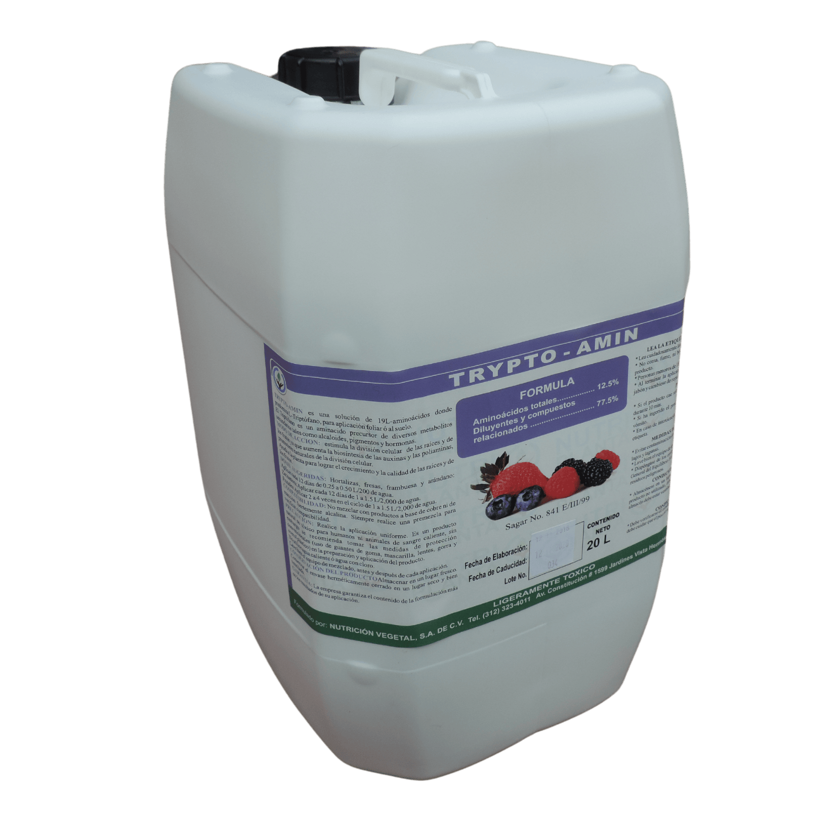 Bioestimulante promotor de la división celular de las raíces y de los frutos ya que aumenta la biosíntesis de las auxinas y poliaminas. Conjuntamente con el Zinc, eficientiza el metabolismo vegetal, la síntesis de proteínas y la producción de ARN. Contiene una solución de 19 L-aminoácidos donde predomina L-Triptófano, para aplicación foliar o al suelo. El triptófano es un aminoácido precursor de diversos metabolitos secundarios tales como alcaloides, pigmentos y hormonas. NUTRIPLANTA TRYPTOAMIN ayuda a la planta para lograr el crecimiento y la calidad de las raíces y de los frutos.