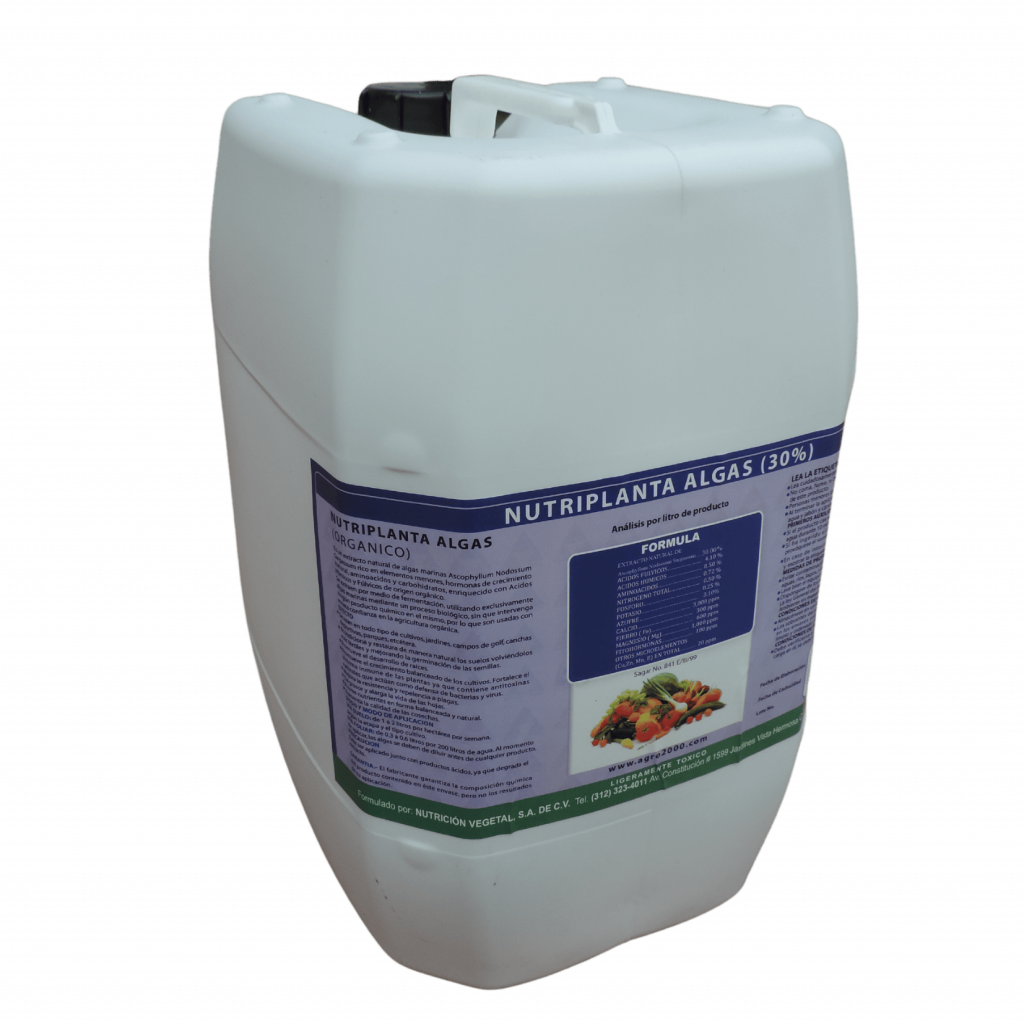 (Solución de Ascophyllum 20%) Solución a base de Ascophyllum nodossum sargassum rico en elementos menores, hormonas del crecimiento natural, Aminoácidos y Carbohidratos. Mejora desarrollo radicular, crecimiento vegetativo, floración, cuaje, tamaño…