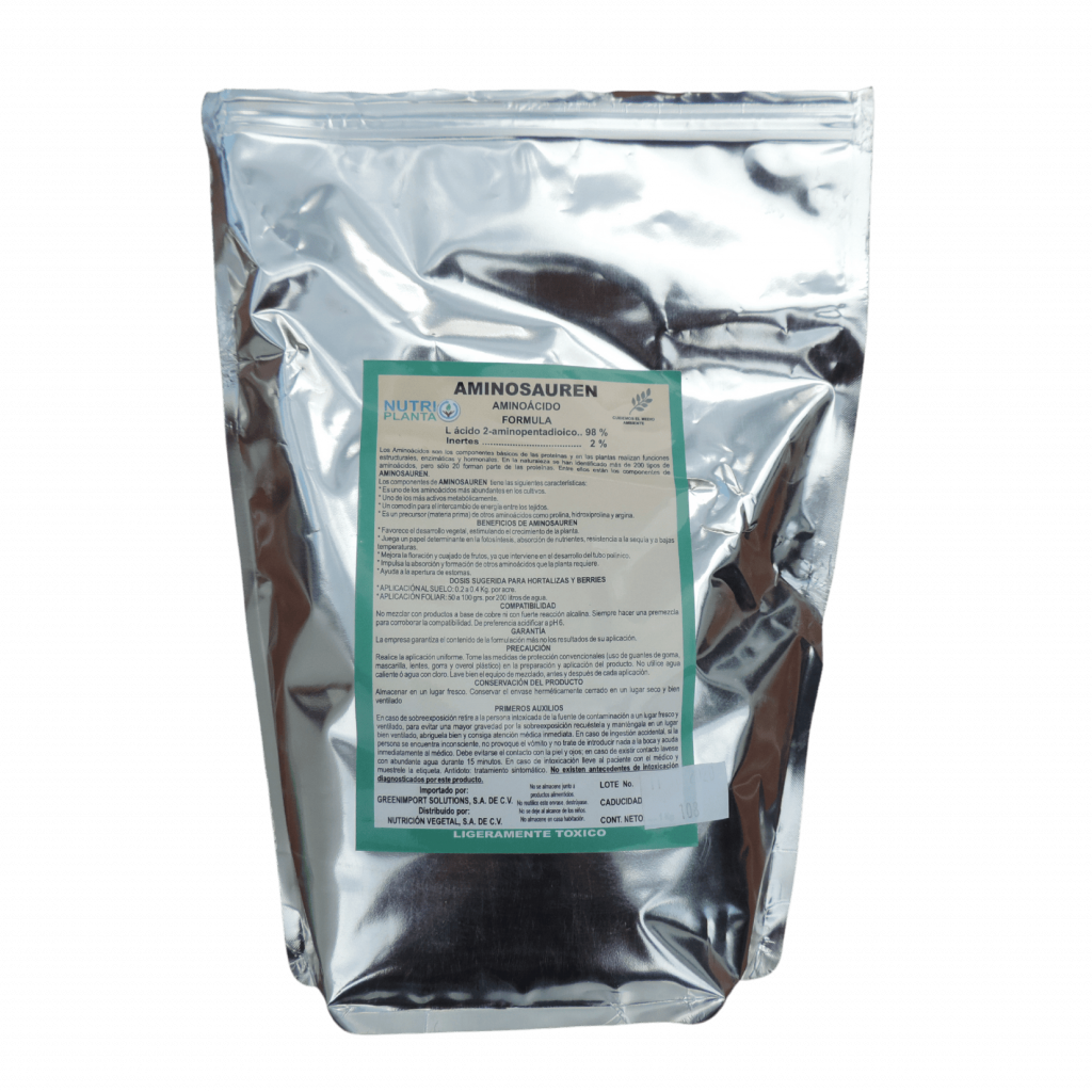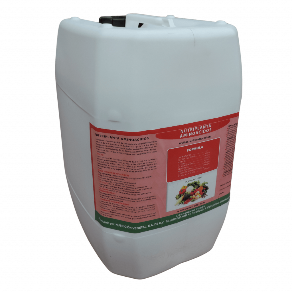 (Solución de L-Aminoácidos 16%) L-Aminoácidos extraídos, por reacción enzimática, de proteínas de soya. Representan un ahorro energético para la planta, mejor recuperación del estrés biótico y abiótico, incremento en la…